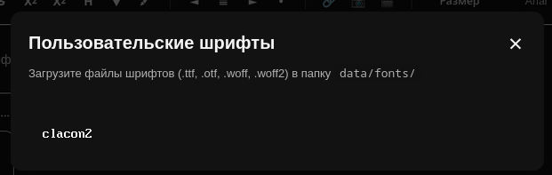 После нажатия на кнопку открывается модальное окно в котром показываются все добавленные пользователем шрифты, они добавляются в папку /data/fonts